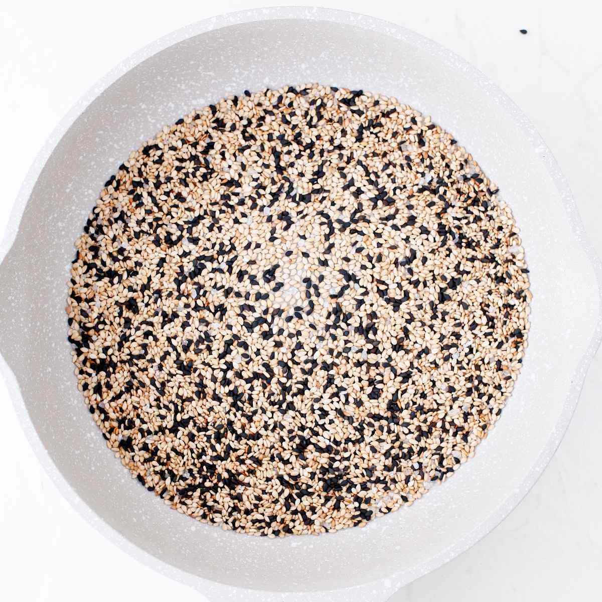 Step 1: Add the sesame seeds to a large pan and lightly toast them over medium heat until they're fragrant.