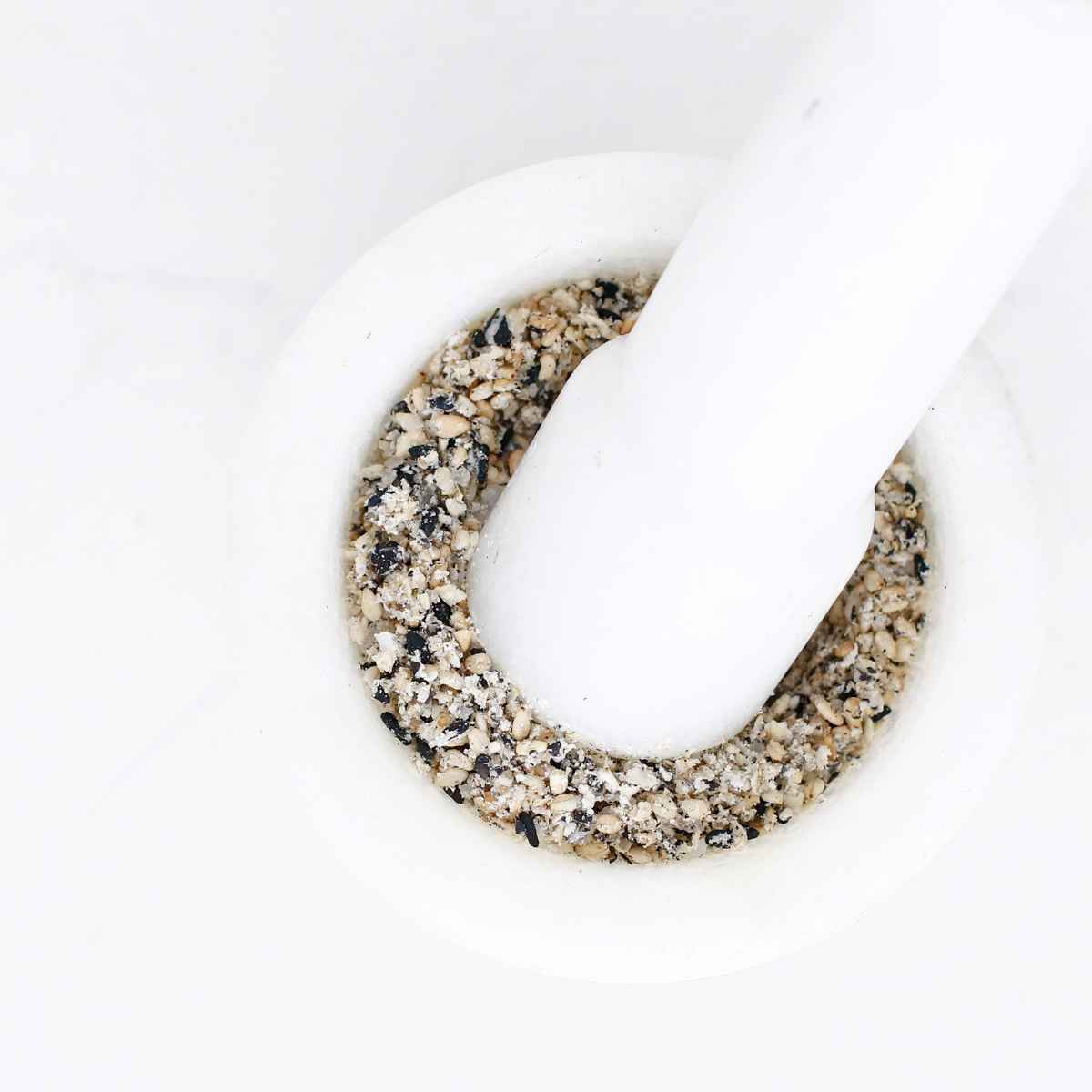Step 2: Allow them to cool down completely. Add the sea salt and coarsely crush them using a mortar and pestle.