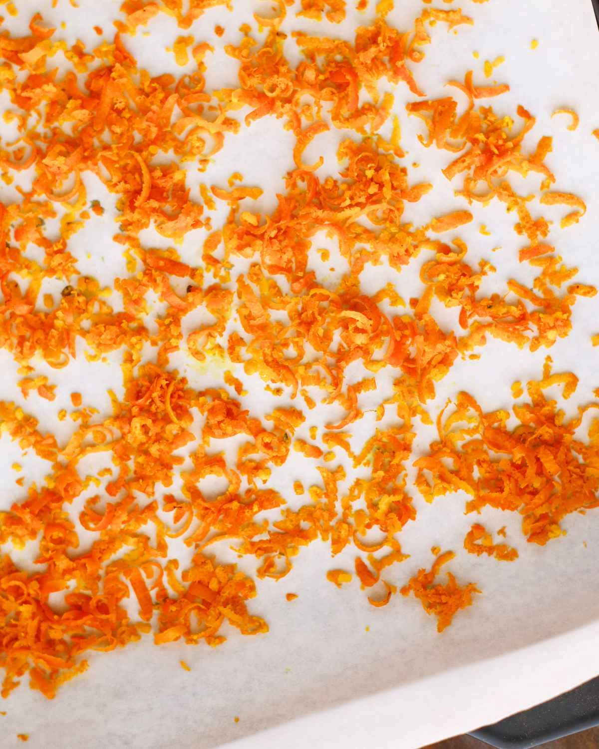 • Set your oven at its lowest temperature and make sure you preheat the oven before you add in the orange zest. This will keep the zest from accidentally burning.