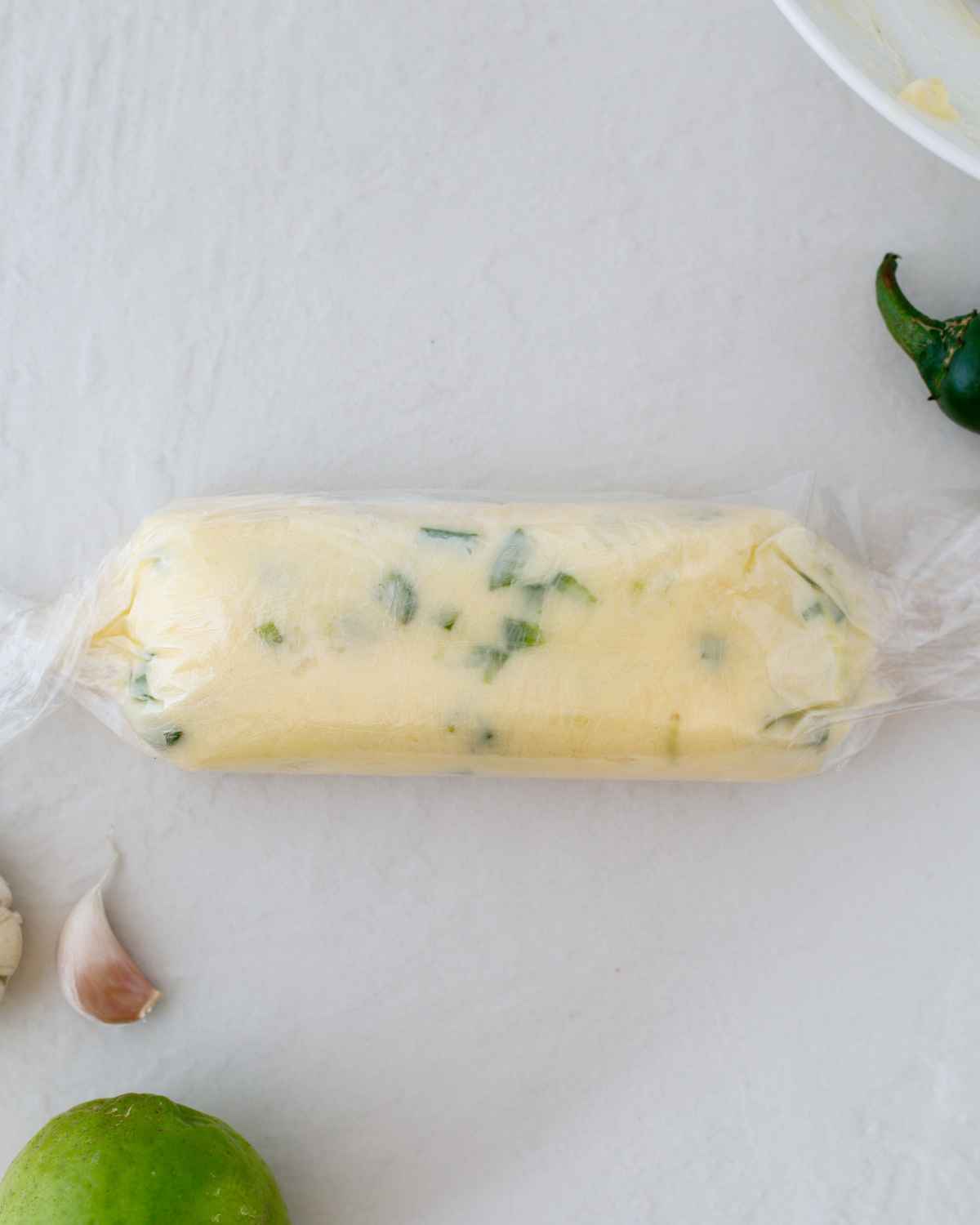 - Roll the cling wrap to shape the jalapeno butter in a log. Refrigerate for an hour or more and use.
