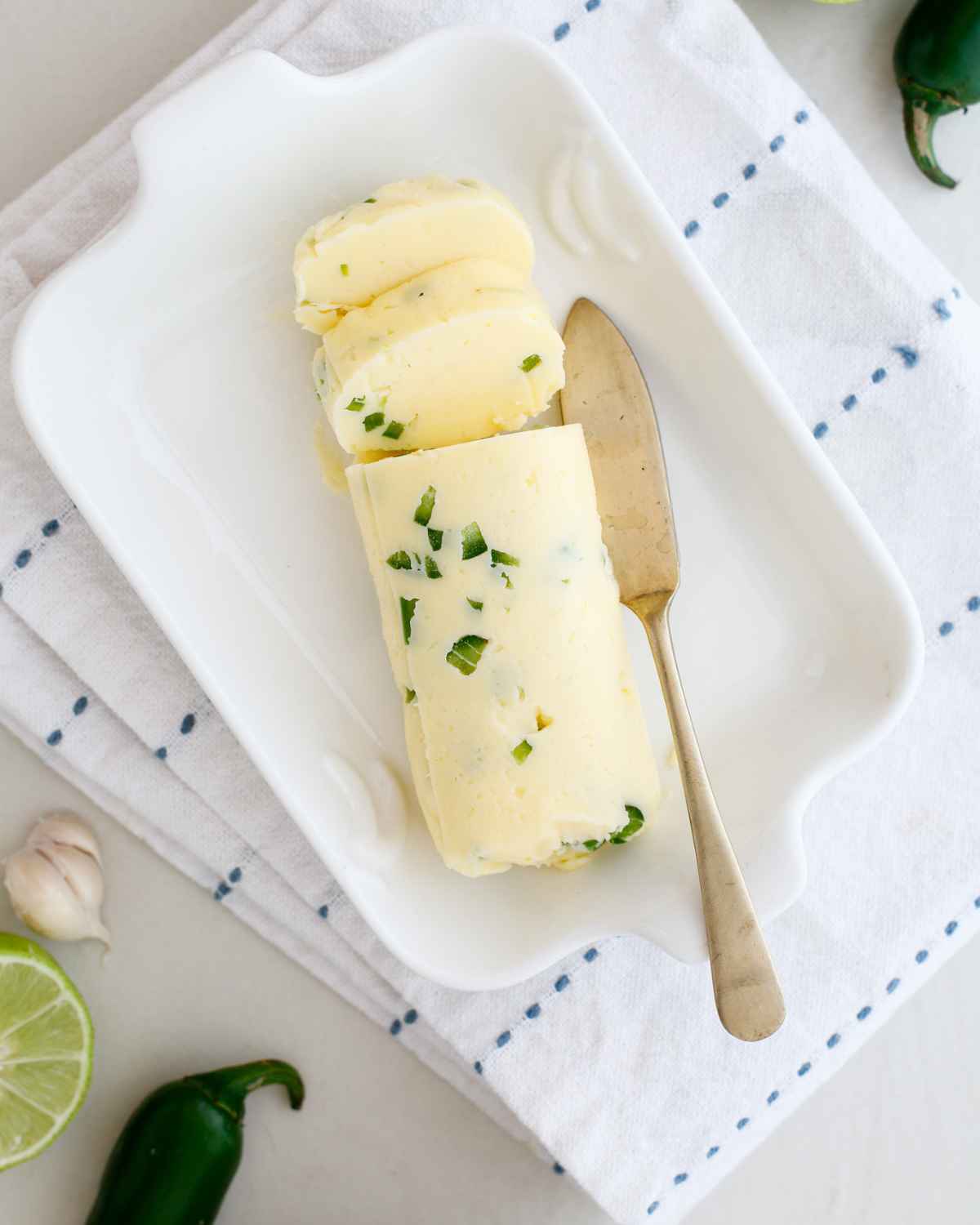 Rich, spicy and slightly tangy, this homemade jalapeno butter is going to be your next favorite condiment to spread over your breakfast toast or brush over your grilled corn.